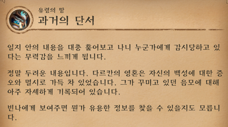 돈스타첨탑 2층으로 올라가니 다르칸의 일지가 떨어져있다. 백성에 대한 증오와 멸시로 가득차있다고 하는데 자세한 내용을 알려면 빈나한테 보여줘야하나보다. 궁금하니 빨리 달려가봐야지.